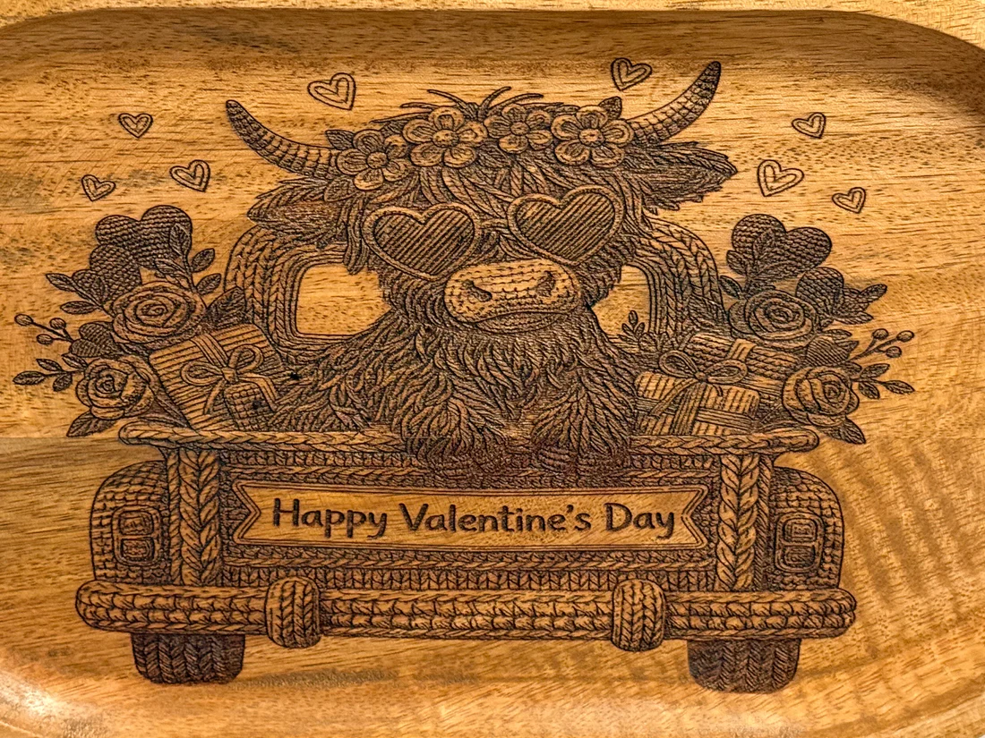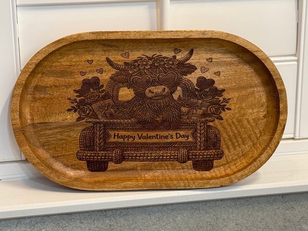 This unique 12in x7in serving dish is almost to cute to use! This dish is made of mango wood and laser engraved. Hosting a party or get-together? Cue the “oohs” and “ahhs” with this charming Highland Cow Oval Serving Plate! Durable mango wood ensures it’ll last through your guests’ enthusiastic munching, while the cute laser engraved design adds a touch of whimsy. So when they’re not busy munching away, they’ll be admired your hosting skills as well as your dish!