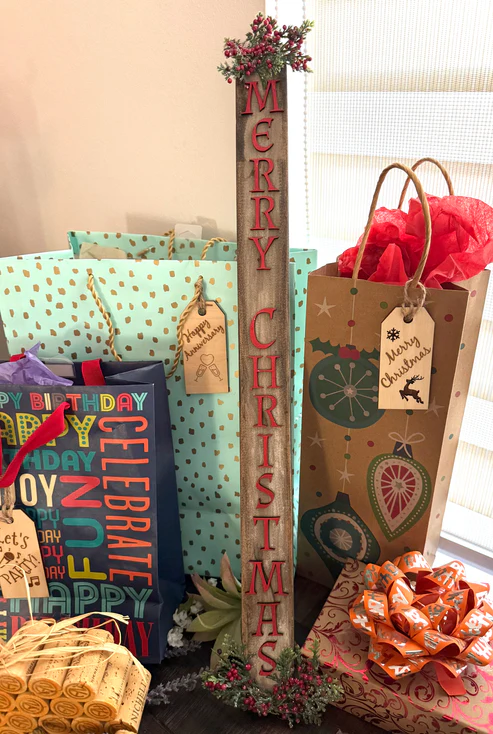 Bring festive cheer to your space with this charming one of a kind hand-painted/stained pine wood sign. Measuring 21.5 inches long with rustic character, it’s the perfect accent for walls, entryways, or shelves during the holiday season.